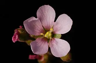 Die Blütenstandsachse ist meist aufrecht, selten am unteren Teil gebogen, am Ansatz behaart, blattlos und bis zu 20 Zentimeter lang, an ihrem Ende trägt sie um die acht, gelegentlich bis zu zwölf kleine, selten offene Blüten an 2 Millimeter langen Blütenstielen. Die Kelchblätter sind verwachsen, die einzelnen Lappen sind bis zu 5 Millimeter lang. Die Kronblätter sind umgekehrt-eiförmig, genagelt, pinkfarben, lila oder weiß und haben eine Länge von bis zu 7 Millimetern.