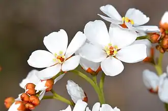 Blütezeit ist von August bis Dezember. Der traubenartige Blütenstand sitzt an der Spitze der Pflanze sowie an den Seitenästen und besteht aus vielen weißen Blüten an 3 bis 8 mm langen Blütenstielen. Die Kelchblätter sind rostorange, eiförmig, 3 mm lang und 1,5 mm breit. Die Ränder sind ganzrandig, die Spitzen spitz, oft gezähnt, kahl und schwarz gepunktet. Die Kronblätter sind verkehrt eiförmig, 5,5 mm lang und 2,5 mm breit mit leicht gekerbten Spitzen. Die 5 Staubblätter sind 1,5 mm lang, die Staubfäden und die Staubbeutel sind weiß, der Pollen gelb. Der Fruchtknoten ist dunkelbraun, fast schwarz, warzig, annähernd kugelförmig, 1 mm im Durchmesser und 0,8 mm lang. Die drei Griffel sind rostorange, 0,8 mm lang und im oberen Drittel in wenige, eher dicke, abgeflacht runde Segmente geteilt. Die Narbe sind weiß und unregelmäßig geschwollen. Sie befinden sich an der Spitze jedes kurzen Griffelsegments.
