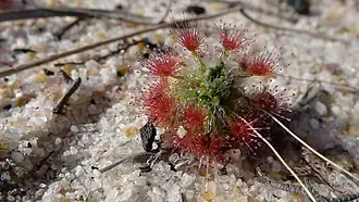 Die Blattspreiten sind annähernd kreisförmig, 1 mm lang und 0,9 mm breit. Die längeren Tentakeldrüsen befinden sich am Rand, kürzere in Inneren. Auf der Unterseite befinden sich einige Drüsen. Die Blattstiele sind bis zu 4 mm lang, am Ansatz 0,7 mm, verjüngen sich auf 0,2 mm an der Blattspreite. Sie sind in Teilen lanzenförmig und auf der gesamten Oberfläche mit einigen winzigen Drüsen besetzt.