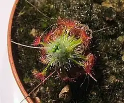 Die bis zu zwanzig Blätter stehen in der Mitte halbaufrecht und außen fast waagerecht. Die schwach behaarten Blattstiele sind vier bis fünf Millimeter lang, an der Basis 0,8 Millimeter breit und verjüngen sich hin bis auf knapp 0,01 Millimeter kurz vor der kreisförmigen, mit den sonnentautypischen Tentakeln besetzten Blattspreite, die einen Durchmesser von etwas über einem Millimeter aufweist.