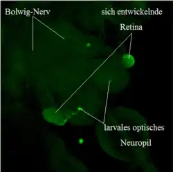 - ↑ a b P. Green, A. Y. Hartenstein, V. Hartenstein: The embryonic development of the Drosophila visual system. In: Cell and Tissue Research. Band 273, Nr. 3, September 1993, S. 583–598.