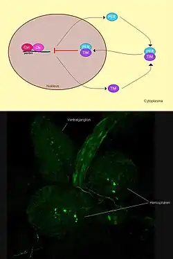 - ↑ a b c d e C. Helfrich-Förster: Neurobiology of the fruit fly’s circadian clock. In: Genes, Brain and Behaviour. 2005, S. 65–76.