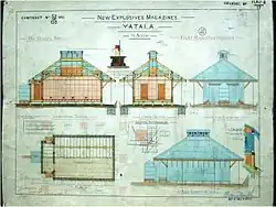 Ende des 19. Jahrhunderts galt bei der Sprengstofflagerung das Prinzip, einer Explosion möglichst wenig Widerstand zu bieten (Verdämmung). Die Lagerschuppen wurden deshalb in Leichtbauweise errichtet. Es wurde darauf geachtet, die Sprengstoffe vor Hitze, Feuchtigkeit und Staub zu schützen. Die Grundform war eingeschossig mit einem doppelten Walmdach mit großem Dachüberstand; die Gebäude standen auf einem Fundament aus Jarrah-Pfählen. Das Tragwerk bestand aus einem Holzrahmen. Die Wände bestanden aus zwei Schichten galvanisiertem Wellblech mit einem Luftraum dazwischen; auf dem inneren Wellblech war eine Holzbrettverkleidung mittels Lattung befestigt, so dass auch dort ein Luftraum entstand. Die dreifache Wandkonstruktion mit jeweils einem Luftraum dazwischen sowie die Dachform sorgten für eine gute Wärmedämmung. Die Schuppen wurden natürlich belüftet. Von einer markanten Laterne führte ein großer Lüftungsschacht durch das doppelte Dach in das Innere; auch im Fußboden befanden sich zehn Lüftungsschächte. So konnte kühle Luft von unterhalb des Gebäudes angesaugt werden. Die Ventilationsschächte und Kanäle waren mit Metallgittern abgedeckt, um Staub und Funken fernzuhalten. Die Außenwände der Lagerschuppen waren weiß gekalkt. Ursprünglich standen Regenwassertanks vor den Lagerschuppen, diese wurden aber entfernt, als die Schmalspurbahn verlegt wurde.[1][5]