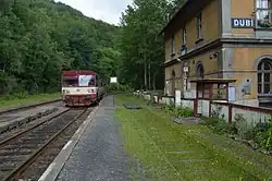 Dubí hat einen Bahnhof an der Bahnstrecke Most–Moldava v Krušných horách, die bis 1945 weiter ins sächsische Freiberg führte. Aufgrund der schwierigen topografischen Begebenheiten im Erzgebirge wurde der Bahnhof als Spitzkehrenbahnhof ausgeführt.