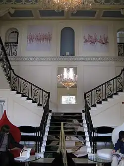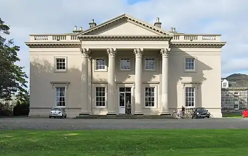 Das Erdgeschoss ist als Hauptgeschoss ausgeführt, was daran erkennbar ist, dass die erste Etage eine geringe Geschosshöhe aufweist. Über dem vorkragenden Traufgesims erhebt sich eine steinerne Balustrade und verdeckt einen Teil des schiefergedeckten Daches. Die Eingangsfront an der Ostseite ist durch Fenster in fünf Achsen unterteilt. Den drei mittleren von ihnen ist ein monumentaler Portikus mit korinthischen Säulen und Dreiecksgiebel vorgebaut. Hinter dem Portikus liegt die zweigeschossige Eingangshalle mit großem Kamin. Von dort führt eine mehrläufige Treppe in das Obergeschoss mit sieben Schlafzimmern und angrenzenden Ankleidezimmern. Die Treppe besitzt ein Geländer aus Schmiedeeisen und einen Handlauf aus Mahagoniholz.[16] Von der zentralen Eingangshalle waren zudem die repräsentativen Räume wie das Frühstücks- und das Esszimmer sowie ein großer Salon (englisch Drawing room) mit anschließendem Schlaf- und Ankleidezimmer erreichbar. Das Esszimmer besitzt dabei die reichste Innendekoration des gesamten Hauses, unter anderem einen Marmorkamin mit Fries, der von dem englischen Künstler Sefferin Alken angefertigt wurde.[17]