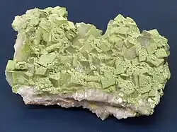 Duftit auf Calcit aus Tsumeb, Namibia – Ausgestellt im Mineralien-Museum Essen-Kupferdreh