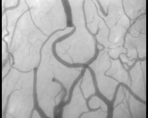 Darstellung der Mikrozirkulation mit Sidestream Dark Field Imaging. Die Blutgefäße heben sich dunkel vor dem hellen Hintergrund ab, da in ihnen das Licht absorbiert wird.