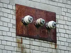 Die Durchführung besteht je nach Ausführung aus verschiedenen Isolationsmaterialien, beispielsweise aus Elektrokeramik, in den der metallische Leiter eingearbeitet ist; er ragt an beiden Enden zum Anschluss der ein- und ausgehenden Freileitung heraus. Häufig, besonders im Bereich von Durchführungen, die mit Hochspannung betrieben werden, ist an der Außenseite zusätzlich ein Überspannungsableiter angebracht.