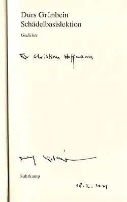 Von Durs Grünbein signierte Buchseite seines Gedichtbands Schädelbasislektion (2011)