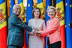 Wenige Wochen nach dem russischen Überfall auf die Ukraine Ende Februar 2022 stellte Moldau kurz nach dem Beitrittsgesuch Georgiens ebenfalls eines an die Europäische Union.[1] Im Oktober 2024 sprach sich in einem Referendum die Mehrheit der moldauischen Bürger dafür aus, das Ziel des EU-Beitritts in der moldauischen Verfassung zu verankern.[2] Bereits im Juni 2024 waren nach einem Beschluss des Europäischen Rates Beitrittsverhandlungen mit Moldau aufgenommen worden.[3]