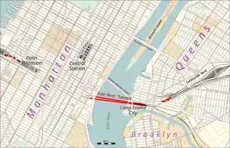 Die East River Tunnels, vielfach auch nur in Einzahl East River Tunnel bezeichnet, sind vier 1910 eröffnete ungefähr 1830 m lange Eisenbahntunnel, die in New York City von Manhattan unter dem East River hindurch nach Queens führen. Sie bestehen jeweils aus einem 1190 m langen Unterwassertunnel, dem eigentlichen East River Tunnel und einem 610 m langen Zufahrtstunnel auf der Ostseite, der in den Sunnyside Yard in Long Island City mündet.[1] Die East River Tunnels sind Teil des Northeast Corridors und werden zusammen mit den Crosstown Tunnels und den North River Tunnels auch als Pennsylvania Railroad Tunnels bezeichnet.