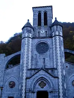 - Ortskirche, gewidmet Johannes dem Täufer und Maria. Bei einem Besuch der Kaiserin Eugénie im Juli 1860 spendete sie eine großzügige Summe für den Wiederaufbau der Kirche. Gustave Lévy, Architekt des Départements, legte sein inzwischen drittes Projekt vor und 1866 begannen die Arbeiten. Bereits von 1869 bis 1870 ruhte die Bautätigkeit, nachdem das Geld ausgegangen war. 1875 wurde sie wieder aufgenommen, diesmal nach den Plänen des kommunalen Architekten Pierre Gabarret. Die Glasfenster mit figürlichen Motiven sind Arbeiten des Glasmalers Paul Chalons aus Toulouse aus dem Jahre 1879, die Glasfenster mit zierenden Motiven des Glasmalers Gustave Pierre Dagrant aus Bordeaux aus dem Jahre 1881. Die Kirche wurde schließlich am 22. Mai 1884 geweiht. Der Langbau birgt drei Kirchenschiffe ohne Querschiff durch Arkaden mit Lanzettbögen getrennt. Der Eingang befindet sich am Fuße des Glockenturms, der von zwei schmalen Türmen flankiert wird. Die Massivität der Fassade wird durch das Gleichmaß der Strebebögen und der verhältnismäßig kleinen Fenster unterstützt. Der klassizistische Stil der Kirche passt sich harmonisch in die Architektur der umliegenden Gebäuden ein.[15][16]
