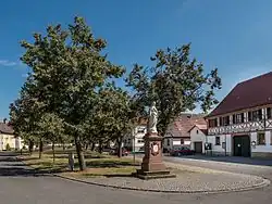 Die katholische Pfarrkirche St. Jakobus Maior liegt nach Osten ausgerichtet leicht erhöht am Nordrand des Dorfes. Sie wird von den teilweise erhaltenen Mauern eines ehemals befestigten Friedhofes umgeben. Der Außenbau aus Sandsteinquadern gliedert sich in ein rechteckiges Langhaus mit Satteldach und einen quadratischen, gotischen Turm, an dessen Nordseite sich die Sakristei anschließt.[13]