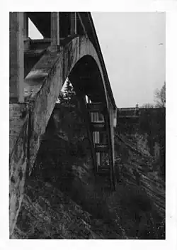 Das 183 Meter lange Bauwerk wurde im Jahr 1929 mit 900.000 Reichsmark Baukosten fertiggestellt und war damals mit 130 Meter Bogenspannweite die weitestgespannte Melan-Bogenbrücke der Welt. Die Fahrbahn liegt 76 Meter über dem Talgrund.