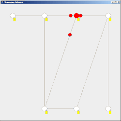 Es gibt zwei Nachrichtentypen: Explorernachrichten, die die Knoten rot färben und Echo-Nachrichten, die die Knoten grün färben. Vor der Ausführung des Algorithmus sind alle Knoten weiß.