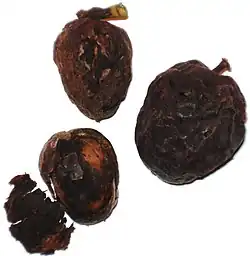 Folge des Befalles der Echten Walnuss durch die Walnussfruchtfliege (Rhagoletis completa) – schwarz verfärbtes, angetrocknetes, sich nicht oder nur sehr schlecht von der Nuss ablösendes Fruchtfleisch