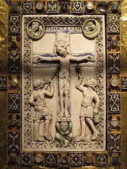 - Kreuzigung Christi mit Longinus. Buchdeckel aus Elfenbein, Nürnberg, Germanisches Nationalmuseum