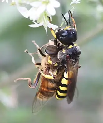 Ectemnius fossorius, Weibchen, mit erbeuteter Mistbiene | ||||||||||||