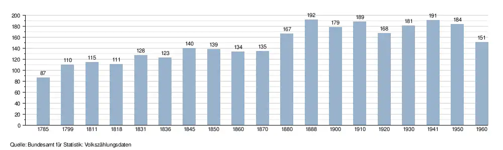 2. a b Daten der Eidgenössischen Volkszählungen ab 1850 nach Gemeinden. (XLSX; 10 MB) Bundesamt für Statistik, Neuchâtel, 12. Juli 2024, abgerufen am 9. September 2025 (Öffnung in Excel nur über "Anhang/Excel-Datensatz" möglich).