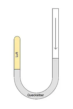 Zwar von Robert Boyle entdeckt, bewies jedoch Mariotte, dass sich Gase, also auch Luft, komprimieren lassen. Ohne die physikalischen Zusammenhänge genauer zu kennen, konstruierte er einen Versuchsaufbau, die Mariottesche Röhre[4], der Luft in einer gebogenen Glasröhre einschließt. Durch Zugabe von Quecksilber lässt sich die Höhe der Luftsäule im abgeschlossenen Teil der Röhre verändern. Aus dieser Erkenntnis formulierte er das nach beiden Forschern benannte Boyle-Mariotte-Gesetz. Die Röhre setzte Mariotte auch als Manometer bei Studien über den Luftdruck in verschiedenen Höhenlagen ein. Eine weitere Erfindung, die ebenfalls mit dem Atmosphärendruck zusammenhängt, ist die Mariottesche Flasche.