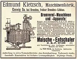 Nach dem Umzug nach Coswig produzierte Kletzsch in großem Umfang Maisch-Maschinen und Hilfsapparate wie Grünmalzquetschen und Pumpen für die Spiritusproduktion.[34] Besonders erfolgreich waren offenbar die schon von Hampel patentierten und von Kletzsch weiterentwickelten Maische-Entschaler.[35] Ab etwa 1915 kamen Walzentrockner und Ventilatoren hinzu. Ein- und Zweiwalzentrockner der Marke Germania für Kartoffel- und Rübenflocken waren die einzigen, deren Walzen statt mit Dampf auch mit 230 °C heißem Öl beheizt werden konnten.[36] Dadurch ließen sich Druckleitungen für Dampf vermeiden. Bei elektrischer Beheizung konnte man sogar auf Dampfkessel verzichten.[37]