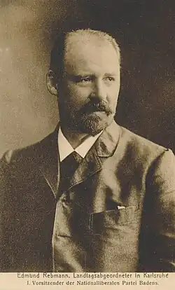 Edmund Rebmanns Vater Fidel Rebmann war Lehrer und Organist in Donaueschingen.[1] Edmund Rebmann engagierte sich sowohl im schulischen als auch im politischen Bereich. So war er Oberschulrat und Realgymnasialdirektor der städtischen Oberschule in Freiburg. Neben seinen Aufgaben als Schulleiter war Rebmann von 1905 bis 1918 Mitglied der Zweiten Kammer des badischen Landtags, in der er als Vorsitzender die Nationalliberale Partei vertrat. 1918 schloss er sich der DDP an, deren Freiburger Wahlkreisorganisation er zeitweise leitete.[2] Rebmann wurde außerdem zum geheimen Hofrat ernannt.[3] Als er 1910 im badischen Landtag für die Simultanisierung der Lehrerseminare stimmte, wurde er in der katholischen Presse scharf angegriffen.[4]