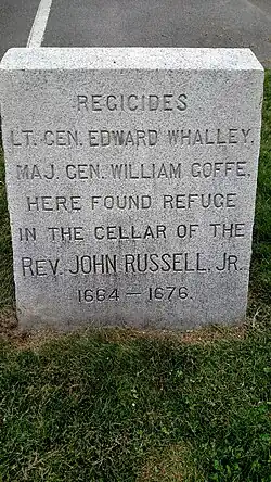 Die zwei zogen weiter nach New Haven, Connecticut, wo sich bereits der weitere als Königsmörder Verurteilte John Dixwell unter dem Pseudonym James Davids verbarg.[8][6] Nach ihrer Ankunft am 7. März 1661 kamen Whalley und Goffe beim Gründer und Vorsteher der Kolonie New Haven, John Davenport, unter.[6] Die Nachricht über den Haftbefehl gegen die beiden erreichten bald auch New Haven, sodass Whalley und Goffe eine List anwandten, um mögliche Verfolger zu täuschen. Zum Schein trafen sie Anstalten, nach Milford aufzubrechen und stellten sicher, dass sie bei ihrem „Aufbruch“ gesehen wurden. Nach Einbruch der Nacht kehrten sie aber still und heimlich nach New Haven zurück. Dort kamen sie bis zum 13. Mai erneut bei Davenport und einigen anderen Sympathisanten unter, bis sich entschlossen, lieber in freier Natur im Wald und in einer Höhle bei Providence Hill Zuflucht zu suchen. Inzwischen ist Providence Hill unter dem Namen West Rock Ridge bekannt und die Höhle, in der Whalley und Goffe unterkamen, trägt den Namen Judges Cave. Im August zogen sie weiter in ein Haus nach Milford, das einem weiteren Sympathisanten namens Tomkins gehörte und blieben dort für zwei Jahre. 1664 sahen sie sich gezwungen, in die Höhle zurückzukehren, als königliche Beamte in Boston eintrafen. Doch amerikanische Ureinwohner hatten den Standort der Höhle enthüllt, als die beiden gerade nicht anwesend waren, sodass sie weiterziehen mussten, um mehr Abstand zu Boston zu gewinnen. Am 13. Oktober brachen sie in Richtung des etwa 100 Kilometer nördlich, im Westen von Massachusetts gelegenen Hadley auf, indem sie ausschließlich bei Nacht reisten, um unerkannt zu bleiben. In Hadley hatte der dortige Pfarrer John Russell eine Unterkunft in seinem Haus zur Verfügung gestellt. Dort blieben sie für 15 oder 16 Jahre unentdeckt und bestritten ihren Unterhalt durch Geldsendungen ihrer Frauen aus England und Geschenke von lokalen Unterstützern. In den ersten paar Jahren lebten sie in ständiger Angst vor ihrer Entdeckung und waren sehr erleichtert, als sie den Zeitungen entnehmen konnten, dass angenommen werde, sie hätten zusammen mit anderen Königsmördern in der Schweiz gelebt und seien dort gestorben.[6] Jeder Versuch der englischen Regierung, den Aufenthaltsort von Whalley oder von Goffe in Erfahrung zu bringen und sie festzunehmen, scheiterte. Whalley war jedenfalls bis 1674 am Leben, wenn am Ende auch bei schlechter gesundheitlicher Verfassung, und lebte vermutlich nicht viel länger. Goffes weiteres Schicksal ist unbekannt.[4]