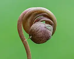 Samenkapsel am spiralig aufgerollten Blütenstandschaft von Cyclamen hederifolium.