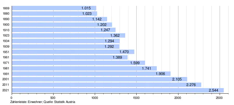 1991 hatte die Gemeinde laut Volkszählung 1.906 Einwohner, 2001 dann 2.112 Einwohner. Ursache für dieses starke Wachstum sind eine positive Wanderungsbilanz und eine sehr positive Geburtenbilanz. Beide Bilanzen blieben weiter positiv, sodass die Bevölkerungszahl auf 2.276 im Jahr 2011 zunahm, um im Jahr 2021 mit 2.544 einen neuen Höchstwert zu erreichen.[3]