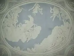 Im Inneren ist vor allem der Festsaal im Obergeschoss des Saalbaus bemerkenswert, dessen bedeutende Stuckausstattung dem Bayreuther Meister Andrea Domenico Cadenazzi zugeschrieben wird und aus den Jahren 1720 bis 1725 stammt. Das ovale Deckenfeld des Saales zeigt als Flachrelief Apollo auf dem Sonnenwagen und die liegende Göttin Ceres, umgeben von reich motivierten Bandel- und Gitterwerk. Über den stirnseitigen Marmorkaminen befinden sich in dekorativen Wandfeldern Reliefbüsten römischer Kaiser unter Lambrequins. In den Ecken stehen Kandelaber aus Stuck, deren bewegter Aufbau mit Putti-Medaillons verziert ist. Einfache gefelderte Stuckdecken finden sich darüber hinaus in den Eingangshallen. Die übrige Stuckausstattung ist nicht mehr vorhanden.