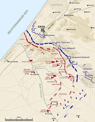 Ein erfolgreicher Flankenangriff der australischen 4th Light Horse Brigade und der britischen 5th Mounted Brigade führte am 31. Oktober 1917 zur Eroberung von Beʾer Scheva. Der Verlust dieser Position machte bei der gegnerischen Heeresgruppe Yıldırım die Gazalinie nicht mehr haltbar. Infolge fielen auch die Posten Hareira and Sheria und nach den Kämpfen bei Tel el Khuweilfe nahmen die Briten am 7. November in der dritten Schlacht um Gaza auch Gaza ein. Die Kämpfe um Jerusalem begannen Mitte November 1917. Allenby konnte am 16. November Jaffa und am 9. Dezember Jerusalem besetzen.