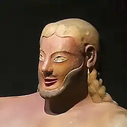 Die schwarzen Haare der Frau sind zu feinen, langen Zöpfen geflochten. Jeweils zwei davon fallen vorne links und rechts über ihren Oberkörper. Auf dem Kopf trägt sie einen Tutulus, die traditionelle etruskische Kopfbedeckung. Das Haupthaar des Mannes ist deutlich heller und in der Mitte gescheitelt. Am Hinterkopf sind die Haare in langen Zöpfen angeordnet. Das Barthaar des Mannes ist dagegen ähnlich dunkel wie die Haarfarbe seiner Partnerin. Die dunkel ockerfarbene Hauttönung des Mannes kontrastiert deutlich zu der blassen cremefarbenen Haut der Frau. Beide Figuren besitzen ähnliche Gesichtszüge mit mandelförmigen Augen, stark gewölbten Augenbrauen und einem archaischen Lächeln.