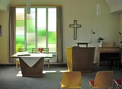 Der schlichte Backsteinbau mit Satteldach ist in eine Wohnsiedlung eingereiht. Die Längsseiten des Gebäudes werden durch Lisenen gegliedert und durch einen Fries abgeschlossen. Auch die Giebelseite zur Straße wird durch einen Fries betont. 1962 wurde der Versammlungsraum umgestaltet.[3] In diesem Zug wurde eine große Fensterfront zur nördlichen Straßenseite eingebrochen und der Haupteingang an die – von der Straßenfront aus gesehen – rechte, westliche Längsseite verlegt. Gleichzeitig wurde dadurch ein kleines Foyer geschaffen, in dem sich Garderoben und der Büchertisch der Gemeinde befanden. An der nördlichen Ostseite waren ein hochsitzendes Rundfenster mit Glasbausteinen und dahinter zwei querrechteckige Fenster mit Glasbausteinen eingelassen. Links von dem großen Fenster an der Straßenseite war ein weißes Kreuz eingemauert, Fenster und Kreuz wurden von einem weißen Rechteck gerahmt.