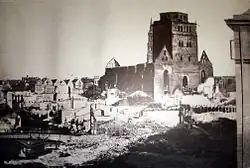 Die Ruine der Hauptkirche St. Nikolai am Hamburger Hopfenmarkt ist als Mahnmal St. Nikolai „den Opfern von Krieg und Gewaltherrschaft zwischen 1933 und 1945“ gewidmet. Die Kirche wurde 1195 begründet und in ihrer letzten neugotischen Ausführung 1874 fertiggestellt. Ihr 147,3 Meter hoher Turm war von 1874 bis 1877 das höchste Bauwerk der Welt.[1] Die Hauptkirche St. Nikolai wurde 1962 als Neubau in den Stadtteil Harvestehude nahe dem Klosterstern verlegt. Nach den Kriegszerstörungen von 1943 und dem weitgehenden Abriss 1951 sind heute neben dem Turm noch ein Teil der südlichen Außenmauer und die Wände des Chors erhalten.