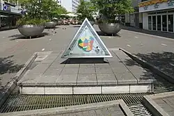 Auch wenn man es auf den ersten Blick nicht vermutet, ist der bunte Hajek-Brunnen auf dem Synagogenplatz ein Denkmal für die ehemalige Synagoge. Offiziell heißt das als Platzgestaltung ausgelegte Kunstwerk „Stadtikonographie mit Stadtzeichen und Wasserflächen“ und wurde 1977 zur „Verschönerung“ des Sparkassenvorplatzes und der darunter liegenden Tiefgarage gebaut. Ebenerdig lässt sich aus den buntbemalten Betonteilen auf verschiedenfarbigen Pflastersteinen und Gehwegplatten und der in der Mitte aufragenden Stahlskulptur kein Stadtpanorama erkennen. Erst ein Blick von oben offenbart das Kunstwerk. Es zeigt eine stilistische Stadtlandschaft mit Gebäuden in unterschiedlichen Graustufen. Nur der bunte Brunnen mit der Stahlskulptur sticht heraus. Er wandelt sich in Draufsicht als blau-orange-gelber Schattenriss der Synagoge. Die Stahlskulptur markiert als X das Zentrum des Platzes.