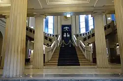 Über dem Portikus sind als Sitzbilder überlebensgroße Personifikationen der Tugenden von dem Bildhauer Hubert Netzer zu sehen. Fritz Coubillier schuf die Brüstungsreliefs am ersten Obergeschoss des Portikus und der Risalite. Sie versinnbildlichen die guten und bösen Eigenschaften, Krieg und Frieden. An den Attiken der Eckrisalite sind Kopfmedaillons zu sehen, die von Leopold Fleischhacker stammen.