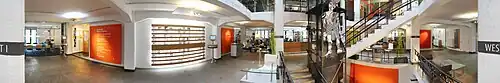 Ein zweiläufiger Treppenaufgang mit ornamentalem Metallgeländer und der mit unter Denkmalschutz stehende historische Lastenaufzug, der aus technischen Gründen nur bis Mitte der 1960er Jahre genutzt wurde, stellen die Vertikalerschließung dar. Die Büros und Ateliers sind mit gläsernen Trennwänden abgeteilt. Die große, schwere zweiflügelige Eingangstür aus Eichenholz wurde restauriert und an anderer Stelle wieder eingebaut.