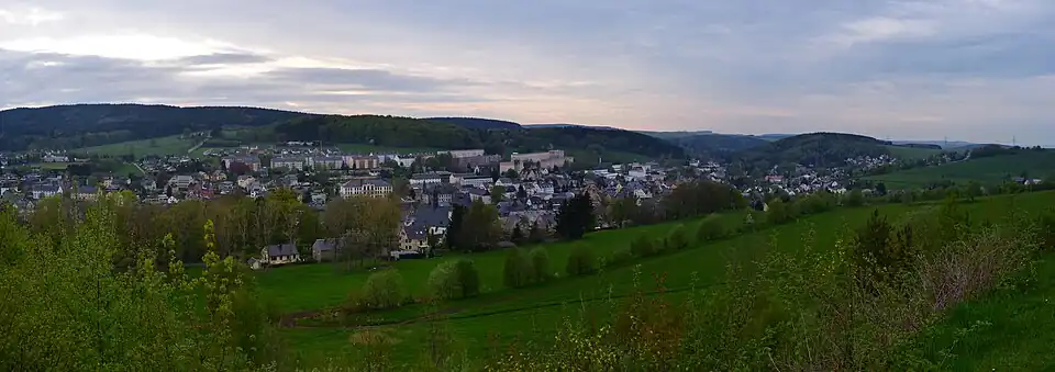 Blick über einen Großteil von Ehrenfriedersdorf, gesehen vom heutigen Besucherbergwerk am Sauberg