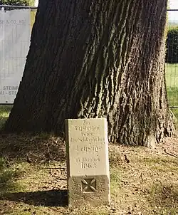 Am Eingang der Grünfläche steht ein Gedenkstein mit einem von Eichenlaub umrankten Tatzenkreuz und der Inschrift[1]