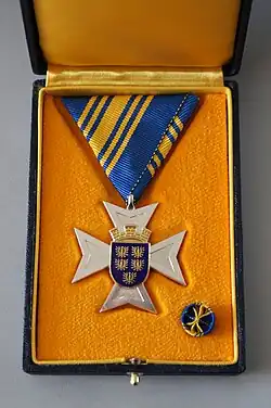 - Brustdekoration: Höhe 65 mm, Breite 65 mm. Vierteiliges Kreuz mit acht Spitzen und Brochierung, blaugelb emailliert, zwischen den Kreuzschenkeln je sieben versilberte Strahlen, überhöht durch das Landeswappen in Email.