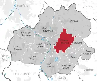 - ↑ Werner Kuhlemann: Die 70 Landgemeinden. In: Herbert Stalling AG in Zusammenarbeit mit der Kreisverwaltung (Hrsg.): Landkreis Lemgo - Landschaft, Geschichte, Wirtschaft. Wirtschaftsverlag, Oldenburg (Oldb) 1963, S. 347.