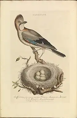 Neben der heute üblichen Bezeichnung als Eichelhäher sind zahlreiche andere Trivialnamen belegt. Darunter sind Namenskombinationen aus verschiedenen Schreibweisen von Häher (beispielsweise Heyer, Heger, Hehr) und Attributen wie Eichel-, Wald-, Holz-, Spiegel-, Baum- oder Nuss-. Manchmal wird der Bestandteil -häher auch durch -rabe, -elster, -krähe, -vogel, -schreier oder Ähnliches ersetzt.[22] Viele der Namen sind lautmalerisch und ahmen verschiedene Rufe nach wie Gäckser, Tschäcker, Jägg, Gäbsch oder Gräcke oder Her(r)eggrägger.[23] Dies ist, wie im Englischen (jay), auch in vielen anderen Sprachen der Fall. Häufig wird die Art zudem in Bezug auf ihr Warnverhalten als Markwart (auch Markolf, Marquard(t) oder ähnlich) sowie als Herold bezeichnet.[24]