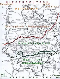 Das Eichsfeldische findet man im thüringischen Norden und südlich des Harzes um Heiligenstadt, Worbis und Mühlhausen bis in den angrenzenden Werra-Meißner-Kreis. Es unterscheidet sich vom übrigen Nordthüringischen durch das Erscheinen von nit anstelle von nicht entlang der sog. Hainichstaffel sowie durch die Vorsilbe ge- anstelle von je-. In den nördlichen Orten des Eichsfeldes gibt es schon ausgeprägte niederdeutsche Dialekteinflüsse, Wortbelege wie mant (nur), mang (zwischen), Kiepe (Tragkorb) oder Pott (Topf) zeigen dies. Einen einheitlichen Dialekt im Obereichsfeld gibt es nicht, da von Dorf zu Dorf kleinere Abweichungen existieren. Der Sprachraum wird dabei von mehreren Sprachlinien durchzogen und teilt das Eichsfeldische in ein Mitteleichsfeldisch (im Leine- und Wippertal) und ein Westhöhen- und Osthöheneichfeldisch (im Südeichsfeld).[1] Bis Anfang des 19. Jahrhunderts wurde der Dialekt im mittleren Eichsfeld dagegen noch dem Nordwestthüringischen und im südlichen Eichsfeld dem Westthüringischen zugerechnet.[2]
