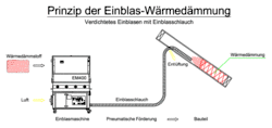 Beim Einblasverfahren wird Wärmedämmstoff mittels einer Einblasmaschine in Bauteile von Gebäuden eingebaut, man spricht auch von der Einblasdämmung. Der Wärmedämmstoff wird der Maschine zugeführt. Die von einem Kompressor gespeiste Einblasmaschine bricht den im Liefergebinde verdichteten Wärmedämmstoff in Stücke und lockert ihn anschließend weiter auf. Der aufgelockerte Wärmedämmstoff wird zusammen mit Luft über einen Schlauch in die zu dämmenden Bauteile transportiert. Im Bauteil verteilt sich der Wärmedämmstoff raumfüllend, wird durch den Druck verdichtet und wird damit zur Wärmedämmung.