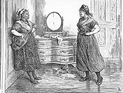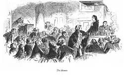 - Dickens arbeitete ab 1836 eng mit dem Graphiker Hablot Knight Browne (1815–1882) zusammen. Sein Pseudonym „Phiz“ wählte er in Anpassung an Dickens Pseudonym „Boz“. Der Autor forderte, dass der Zeichner die Erinnerungen des Protagonisten-Erzählers in eine objektive oder dramatische Sichtweise der dritten Person übersetzt.[26] Einige seiner Illustrationen enthalten Details, die nicht im Text enthalten sind, aber einen Charakter oder eine Situation beleuchten. So werden Ereignisse zusätzlich kommentiert. Die Bilder können also mehr aussagen, als der Erzähler in seinem Text sagt. Dickens untersuchte die kleinsten Details und verlangte manchmal Modifikationen.