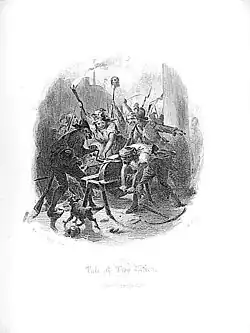 - Frederick Barnard (1846 – 1896) wurde 1871 vom Verlag Chapman & Hall, der Dickens Werk mit Unterbrechung ab 1836 bis zu seinem Tod im Jahr 1870 verlegte, beauftragt, 9 Bände der Volksausgabe Dickens', darunter „A Tale of Two Cities“, zu illustrieren. Damit trat er die Nachfolge von Hablot Knight Brownes an.