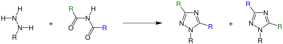 In dem Fall, dass die organischen Reste am Diacylamin unterschiedlich sind, entsteht ein Gemisch isomerer Triazole. Der Rest am Imid, der von der stärkeren Säure abstammt, wird hauptsächlich in der Position 3 des Triazols angetroffen. Bei zwei gleichen Acylgruppen am Amin entsteht entsprechend nur ein Produkt.[1]