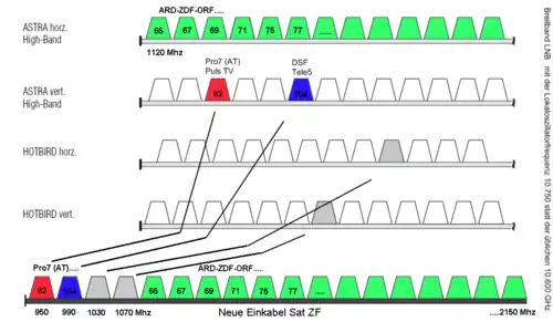 - Neue HDTV-Digitalprogramme, die nach einer ASTRA-PAL-Einstellung möglicherweise künftig konzentriert im SAT-Frequenzbereich 10,70 GHz–11,70 GHz senden werden, können mittels programmierbarem Einkabelsystem ebenso (typisch vier beliebige Transponder) in eine Einkabel-ZF eingebunden werden.