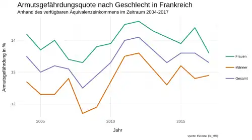 So galten im Jahr 2008 13,3 % der weiblichen Bevölkerung Frankreichs als armutsgefährdet, verglichen mit 11,7 % der männlichen Bevölkerung. Auch die Armutsgefährdungsquote nach Geschlecht steigt von 2008 bis 2012 am stärksten an, sodass im Jahr 2012 14,6 % der Frauen und 13,6 % der Männer als armutsgefährdet eingestuft wurden. Im Jahr 2017 galten schließlich 13,6 % der Frauen und 12,9 % der Männer als armutsgefährdet. Über den gesamten Zeitraum zeigt sich durchgehend, dass Frauen durchschnittlich stärker von Armut bedroht sind.[18]