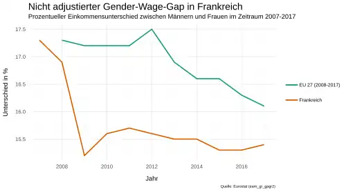 Aus der beigefügten Grafik[21] ist die Entwicklung des Gender-Wage-Gaps, also dem Unterschied in den durchschnittlichen Einkommen zwischen Frauen und Männern, in Frankreich über den Zeitraum 2007–2017 ersichtlich.